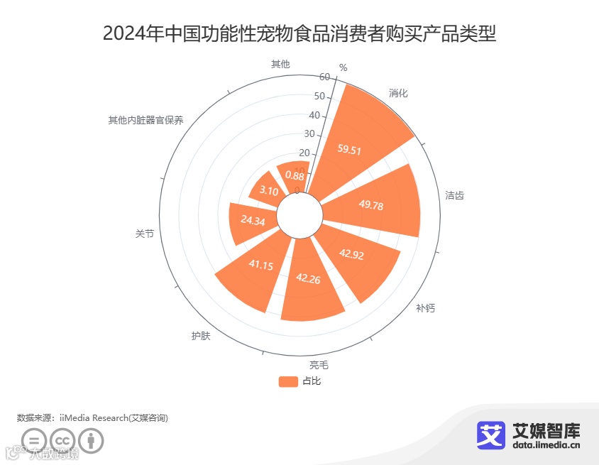 消费者越来越关注宠物的健康,对宠物食品的要求也越来越高。近年来,天然、有机、无添加的宠物食品受到广泛关注。消费者倾向于选择含有优质蛋白质、低脂肪、高纤维的食品,以满足宠物的营养需求。iiMedia Research(艾媒咨询)调研数据显示,超八成宠物主会为自己的宠物购买功能性宠物食品。在2024年中国功能性宠物食品消费者购买产品类型中,消化、洁齿、补钙、亮毛、护肤是主要购买类型,分别占比59.51%、49.78%、42.92%、42.26%和41.15%。