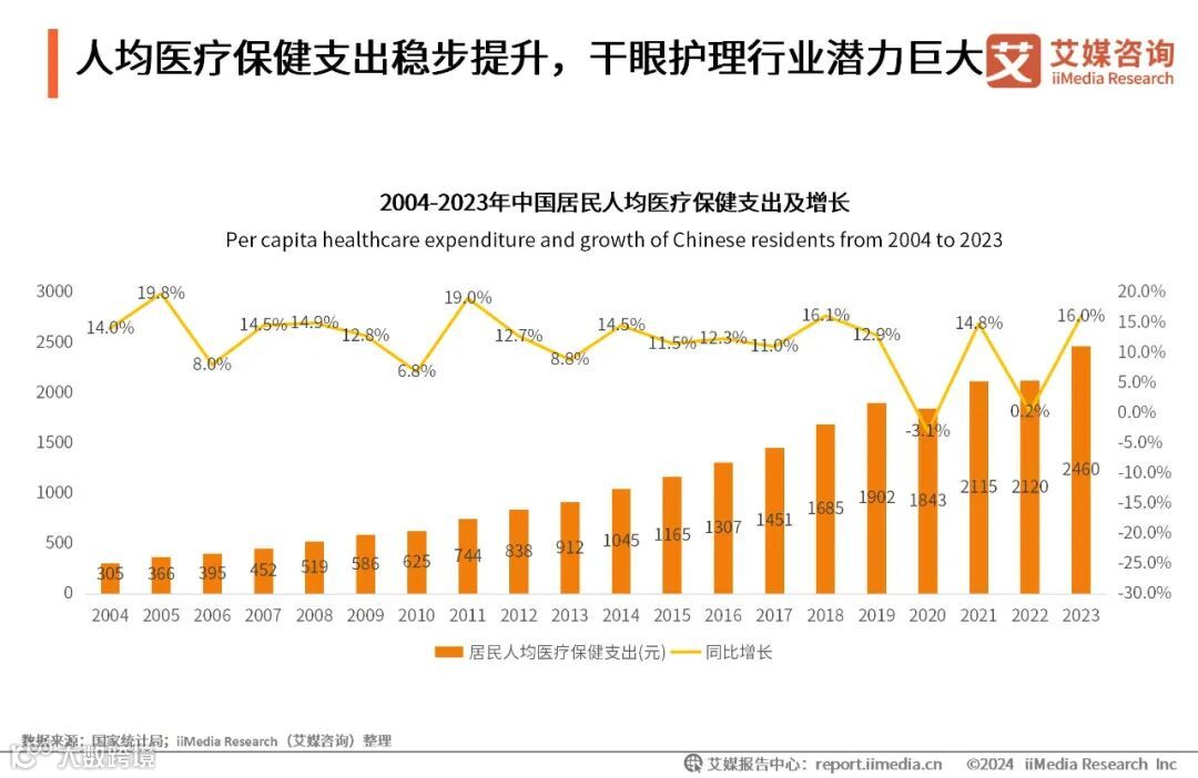 数据显示,近20年来,中国居民人均医疗保健支出整体呈现大幅增长趋势,2004年中国居民人均医疗保健支出为305元,2023年增至2460元,同比增长16.0%。随着中国居民的健康意识不断提高,其对眼部健康的重视程度也在不断加强,为干眼护理行业的发展提供了巨大的市场空间。