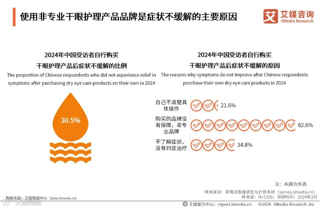 iiMedia Research(艾媒咨询)调研数据显示,30.5%的受访者自行购买干眼护理产品后症状持续不缓解;82.6%的受访者认为症状持续不缓解的主要原因是自行购买干眼护理产品的品牌没有保障,34.8%的受访者认为症状持续不缓解的原因是不了解症状,未对症治疗。