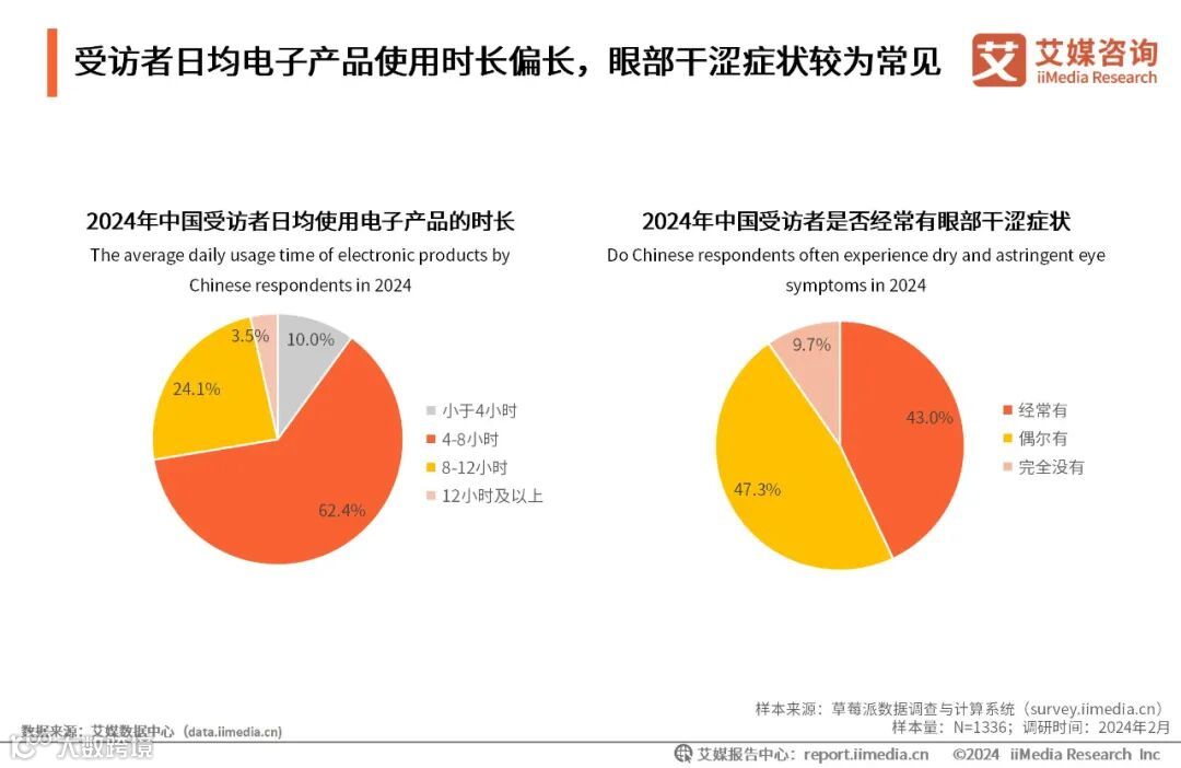 iiMedia Research(艾媒咨询)调研数据显示,受访者日均使用电子产品的时长集中在4-12小时,其中,日均使用电子产品时长在4-8小时的受访者占比62.4%。经常有眼部干涩症状的受访者与偶尔有眼部干涩症状的受访者比例相近。长期使用电子设备、用眼过度或是受访者眼部出现干涩症状的原因之一。
