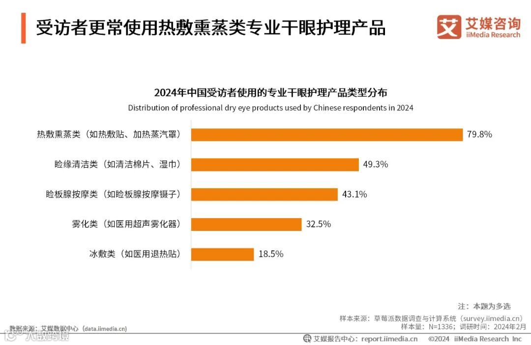 iiMedia Research(艾媒咨询)调研数据显示,受访者更经常使用热敷熏蒸类专业干眼护理产品(79.8%),其次是睑缘清洁类和睑板腺按摩类专业干眼产品,分别占比49.3%和43.1%。热敷熏蒸类专业干眼产品使用方便,体验舒适,成效显著,符合广大患者的眼部护理需求。