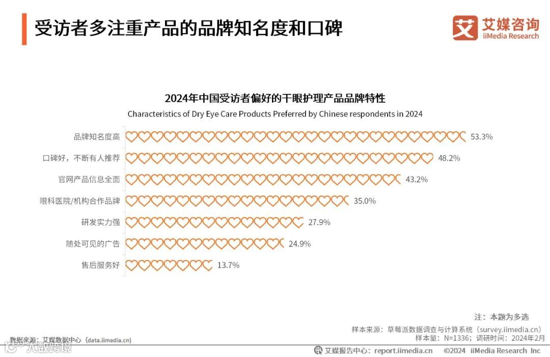 iiMedia Research(艾媒咨询)调研数据显示,品牌知名度(53.3%)、品牌口碑(48.2%)、产品信息全面(43.2%)和眼科医院或机构合作品牌(35.0%)是受访者较为看重的干眼护理产品品牌特性。艾媒咨询分析师认为,干眼护理产品企业在保证产品质量的前提下,需加强品牌建设和口碑营销,提高消费者对于品牌的信任度以及忠诚度。
