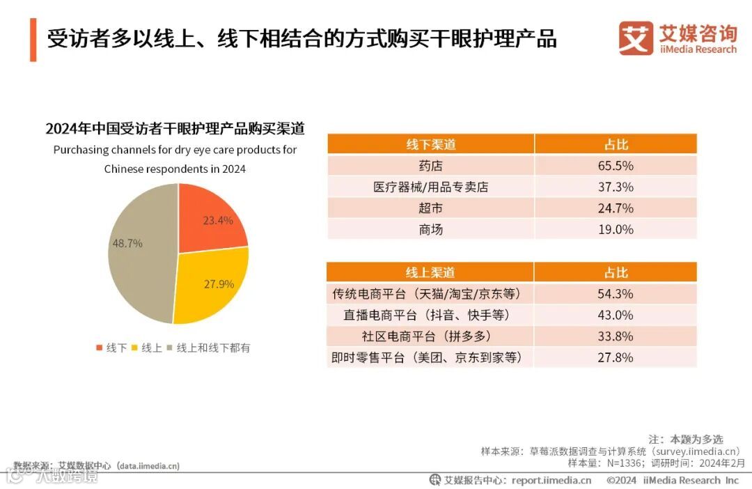 iiMedia Research(艾媒咨询)调研数据显示,48.7%的受访者通过线上和线下两种渠道购买干眼护理产品。线下渠道中,药店是主要的购买渠道,占比达65.5%;线上渠道中,传统电商平台如天猫、淘宝等(54.3%)是受访者主要的购买渠道。