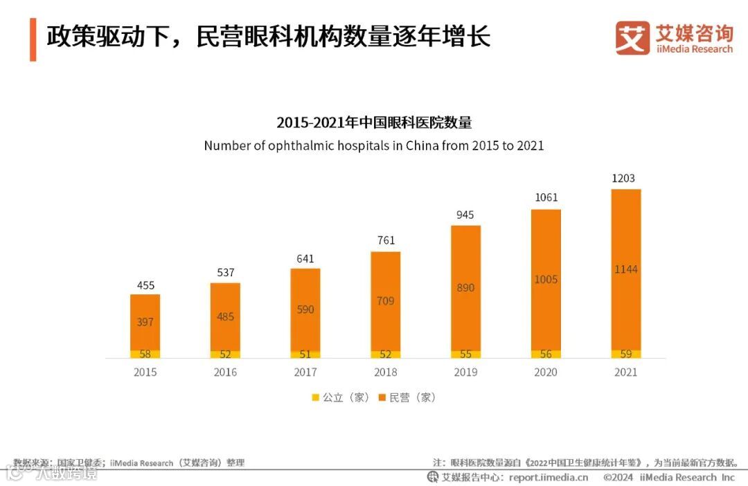 在相关政策的支持下, 中国民营眼科医疗服务得到迅速发展。数据显示,2015-2021年,中国公立眼科医院数量大体保持稳定,总体数量在50-60家之间。中国民营眼科医院数量呈持续增长的态势,由2015年的397家增至2021年的1144家,CAGR达到19.3%。