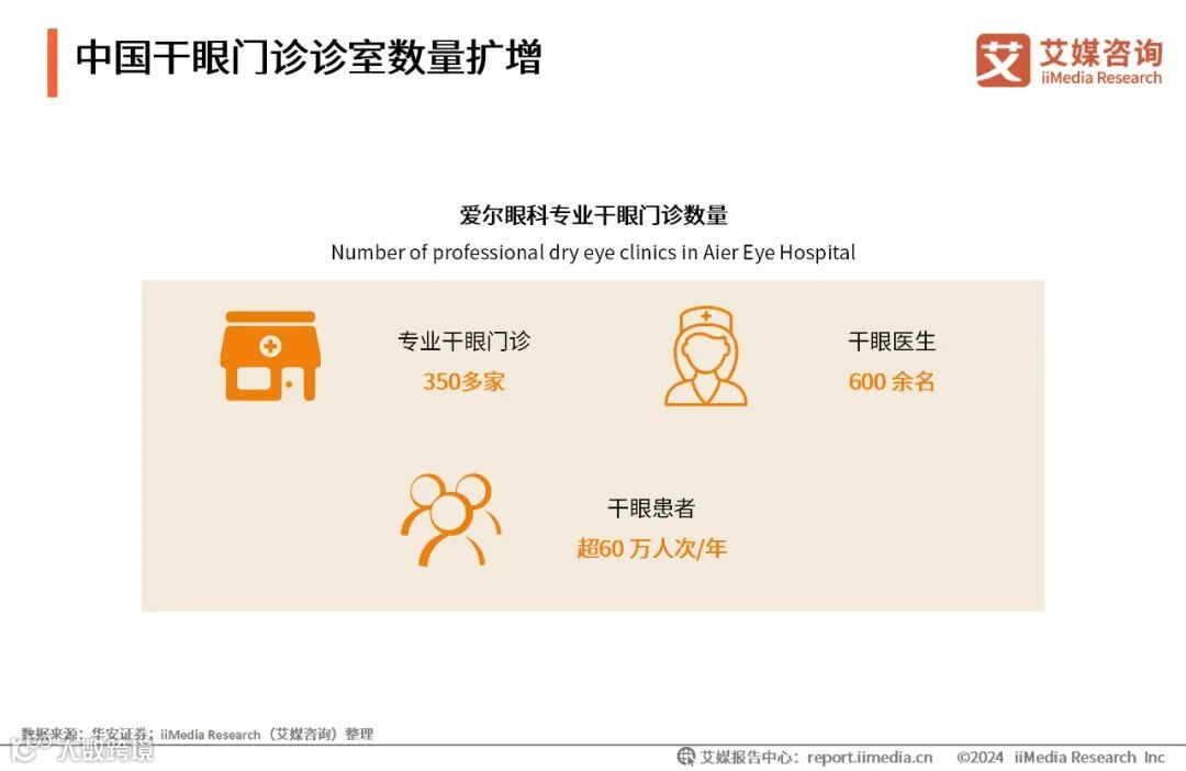 近年来,因干眼患者就诊数量提升,干眼门诊建设显得尤为重要。为帮助更多人远离干眼困扰,诸多眼科医院专门开设了干眼门诊,以应对越来越多的干眼患者。以爱尔眼科医院为例,据华安证券于2022年5月发布的《砥砺前行,民营眼科龙头持续领跑》报告,爱尔眼科在全国有 350 多家专业的干眼门诊,600 余名干眼医生,每年接诊超过 60 万人次干眼患者。