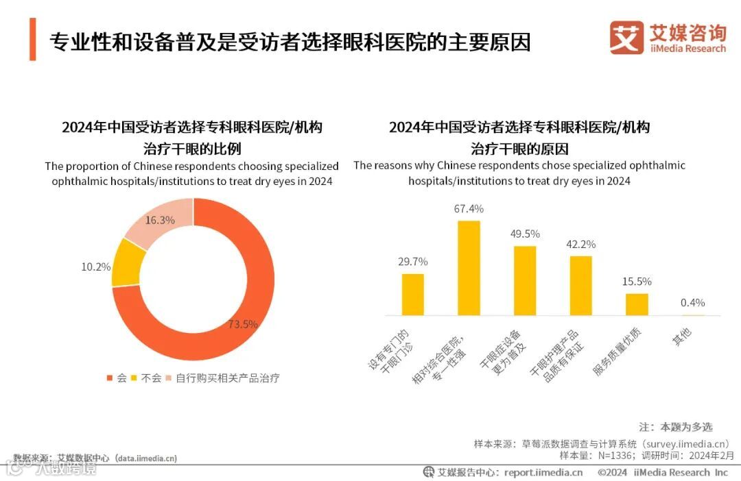 iiMedia Research(艾媒咨询)调研数据显示,超七成的受访者会选择到专科眼科医院或机构治疗干眼,其中,相对综合医院专一性强(67.4%)是受访者选择专科眼科医院或机构最主要的原因;95.9%的受访者会选择医生开具的专业干眼护理产品,其中,专业干眼护理产品的安全性(85.4%)是受访者最关心的问题。