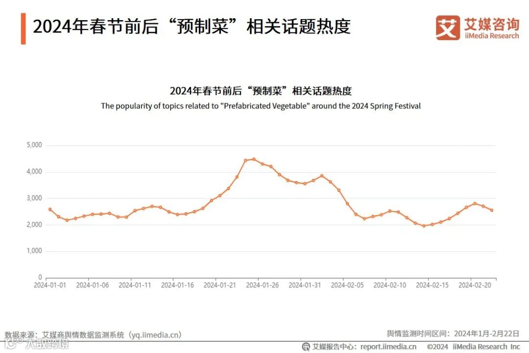 iiMedia Research(艾媒咨询)数据显示,预制菜作为年菜主要类型之一,在2024年春节前夕期间保有一定的相关话题讨论热度。自1月20日#辛巴称最应该给孩子吃预制菜#事件,提前引发广大网友对于“预制菜”相关话题的讨论,并随着春节的来临,预制菜销量居高不下,相关话题网络热度更是同步上涨。