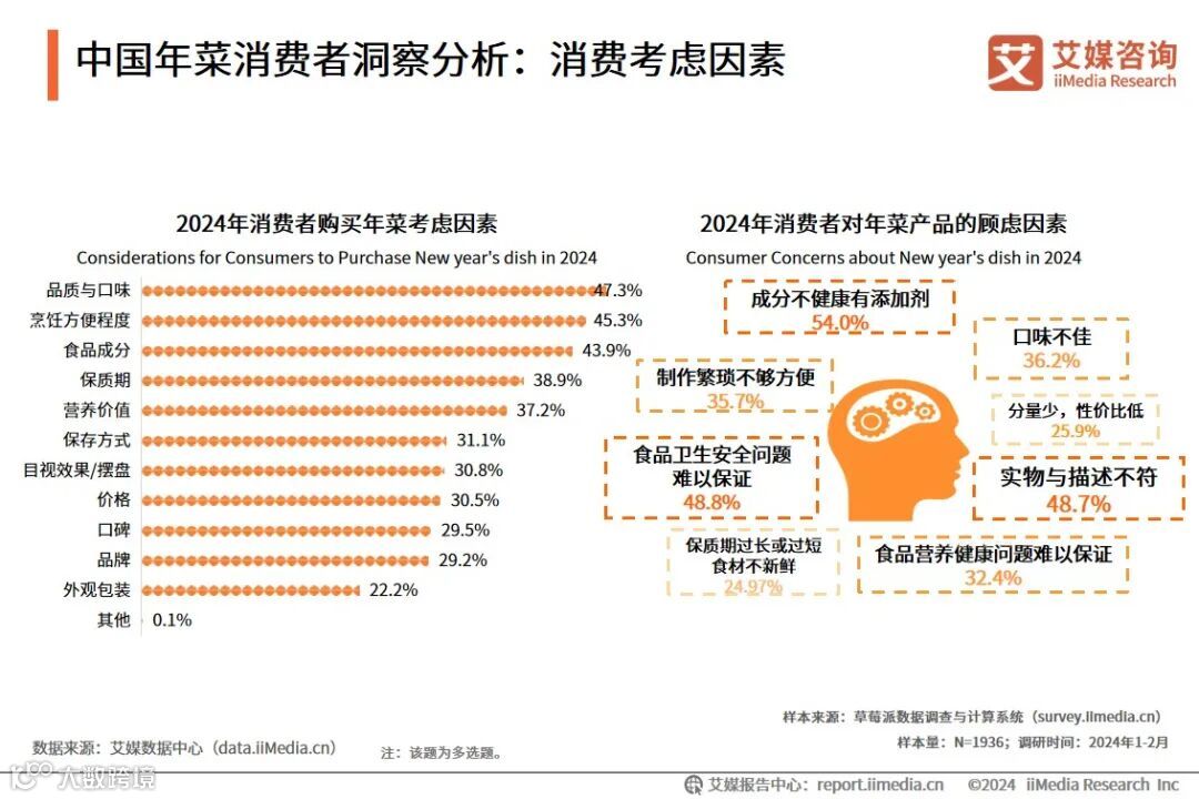 iiMedia Research(艾媒咨询)数据显示,消费者购买年菜时较关注的是产品品质与口味,占比为47.3%,其次是产品的烹饪方便程度和食品成分,分别占比45.3%和43.9%。消费者对年菜产品仍有顾虑,更多集中在成分不健康、食品卫生问题,分别占比54.0%和48.8%。艾媒咨询分析师认为,消费者对年菜产品有较高的口味需求,并且比较在意便利性和食品安全问题,年菜行业在追求菜式精美和便捷的同时,也要对食材安全进行严格把控。