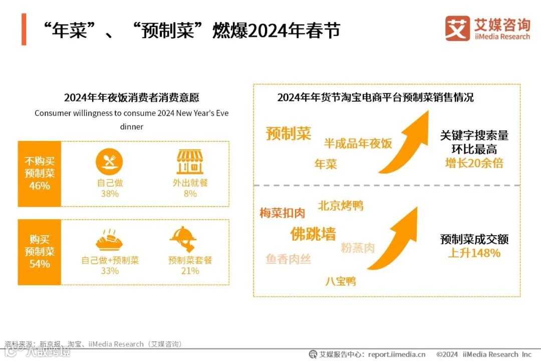 2024年春节期间预制菜呈现一片火爆现象,数据显示,超一半的消费者购买预制菜作为自己家庭的年夜饭;淘宝年货节期间“预制菜”“半成品年夜饭”等关键词的搜索量环比最高增长20余倍,便捷、种类丰富、性价比高等特点使得预制菜市场迎来新年“开门红”。