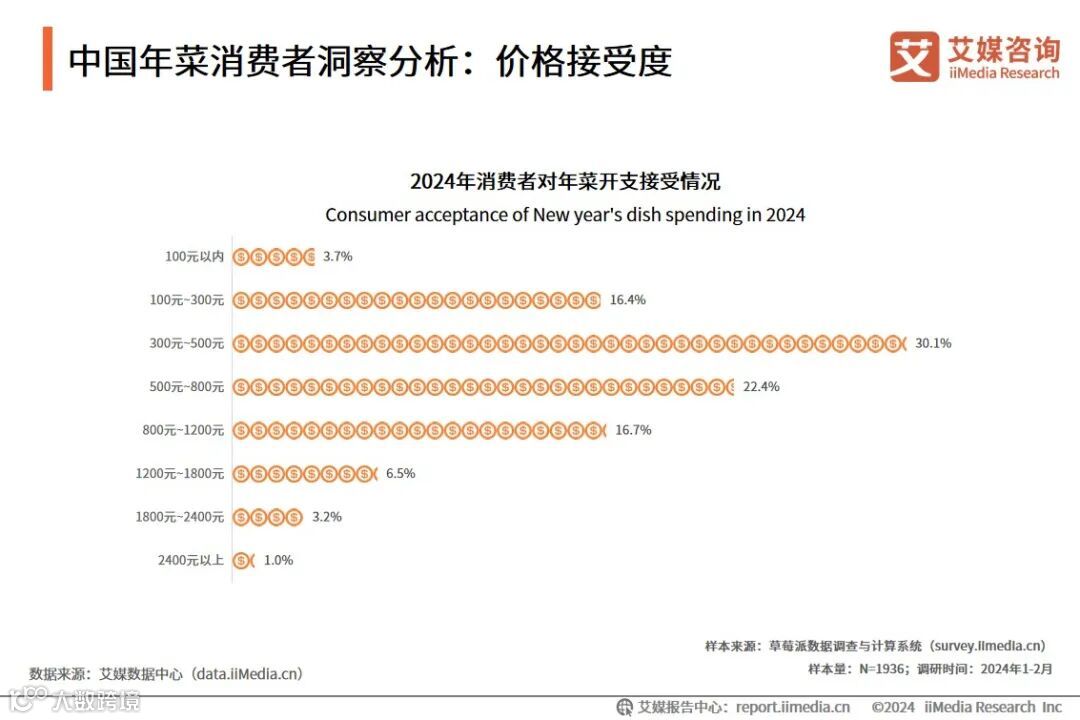 iiMedia Research(艾媒咨询)数据显示,目前消费者对年菜开支的接受区间集中在中端价位,较多消费者愿意花费300元~500元购买年菜产品,占比达30.1%;22.4%消费者愿意花费500~800元购买年菜产品。艾媒咨询分析师认为,高性价比的年菜产品有更广阔的市场。
