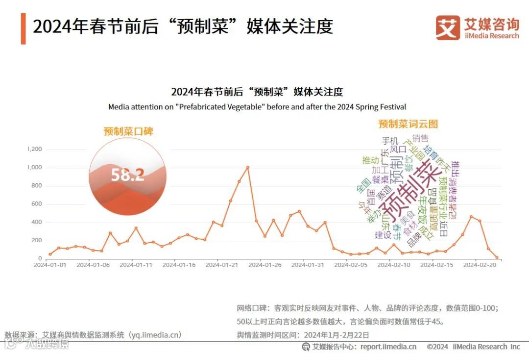 iiMedia Research(艾媒咨询)数据显示,自2024年1月21日起,#辛巴称最应该给孩子吃预制菜#事件舆论发酵后,“预制菜”的媒体关注度显著上升,于1月24日达到峰值。大部分网民讨论预制菜均与食材、质量等主题挂钩;预制菜口碑为58.2,网络正向舆论较多,表明网民虽对预制菜仍存有一定争议,但预制菜方便、快捷等优点得到大部分网民的认可和支持。