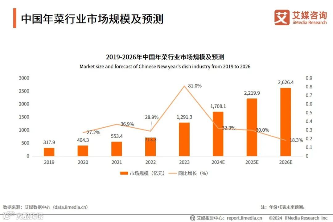 iiMedia Research(艾媒咨询)数据显示,2023年中国年菜行业市场规模为1291.3亿元,同比增长81.0%。企业通过开发年菜新产品体系,营造新消费场景,市场呈现高速增长势头, 预计2024年中国年菜行业市场规模为1708.1亿元,2026年市场规模有望达2626.4亿元。“年菜经济”全产业链互联互通,促进农产品稳产保供,利于引领春节消费“新食尚”,促成新消费欲望。