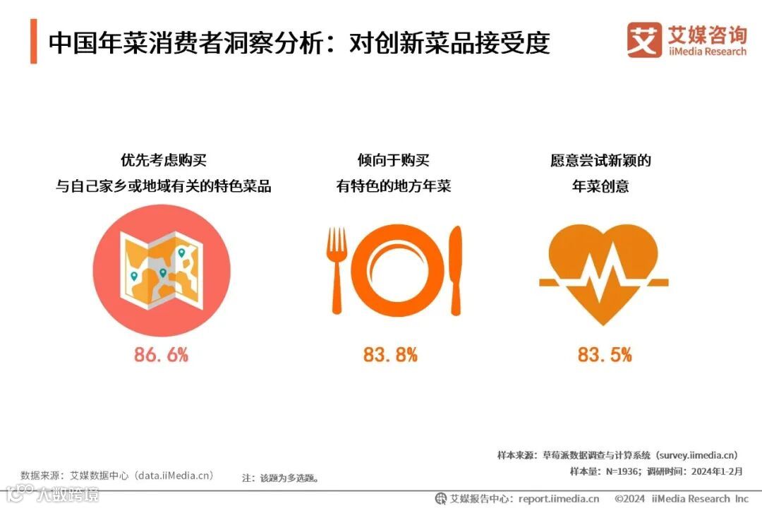 iiMedia Research(艾媒咨询)数据显示,86.6%消费者会优先考虑购买与自己家乡或地域相关的菜品,83.8%消费者会倾向购买有特色的地方年菜,并且大部分消费者愿意尝试新颖的年菜创意,达83.5%。艾媒咨询分析师认为,年菜是特殊的节庆产品,在提供比较大众化家常菜品的同时也需要体现地方特色。在春节等节庆中,既能够保持传统口味,又能在此基础上推出创意菜品会更容易吸引消费者购买。