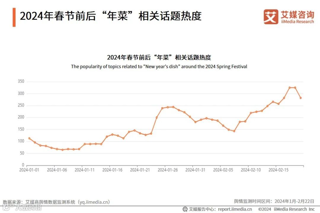 iiMedia Research(艾媒咨询)数据显示,有关“年菜”的话题讨论热度自2024年1月末迎来了一次小高峰;从除夕夜开始,网友因制作年夜饭、走亲戚送礼等原因,年菜网络话题热度不断上升,2月18日达到峰值,之后讨论热度波动下降。