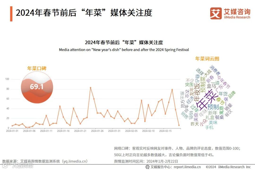 iiMedia Research(艾媒咨询)数据显示,年菜媒体关注度于2024年1月24日达到第一个关注度峰值,春节期间媒体持续对年菜保持一定的关注度,并在春节假期结束后达到第二个关注度峰值。大部分网民讨论话题均与春节、预制菜等主题挂钩;年菜口碑为69.1,表明网民针对年菜的正向舆论较多,普遍对年菜的接受度较高。