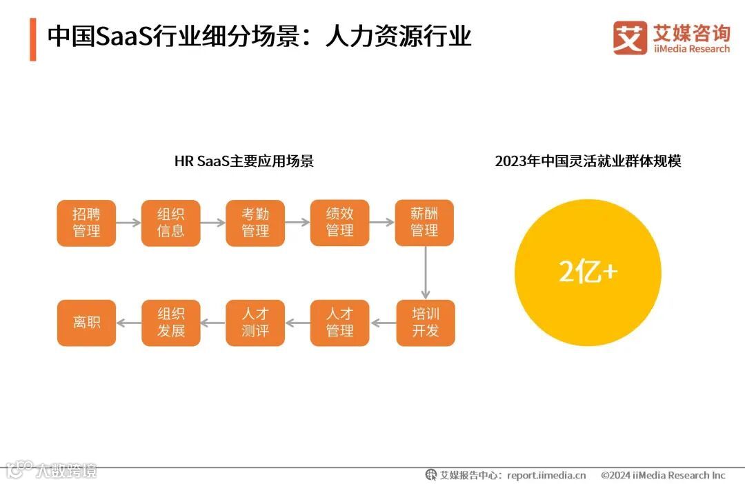 HR SaaS覆盖招聘管理、核心人力管理(组织信息、考勤管理、绩效管理、薪酬管理)、培训开发、人才管理、人才测评、组织发展等全链条服务。企业可通过HR SaaS产品完成从员工招募、入职、管理、发展、离职整个全生命周期管理,实现人力资源数字化管理,大幅提升企业人才管理效率。2021年十三届全国人大四次会议闭幕后,国务院总理李克强在回答中外记者提问时介绍,中国的灵活就业正在兴起,2021年已经涉及到两亿多人。灵活就业群体规模的逐渐增大将推动HR SaaS的发展。