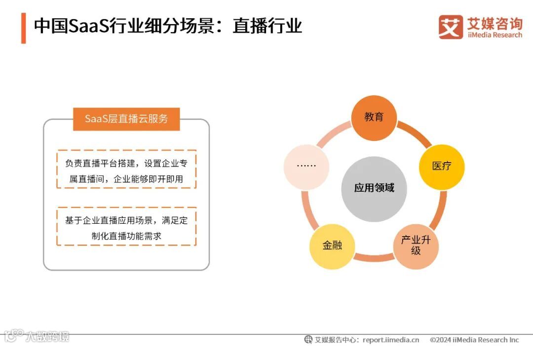 随着短视频软件的兴起,视频直播成为个人或企业的传播工具。除了个人层面的直播形式,企业层面也借助视频直播,实现企业培训、活动直播、市场拓展等方面的创新。在产业互联网快速演进的背景下,企业直播发展迅速。SaaS层面的直播云服务负责直播平台的搭建,满足企业定制化的直播需求,且直播SaaS的应用领域广泛,包括教育、医疗、金融、产业升级等。