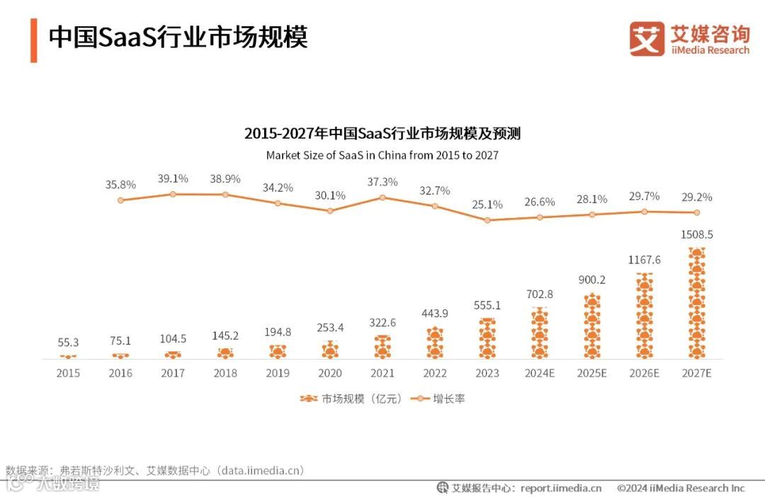 市场规模:预计2027年中国SaaS行业市场规模将超1500亿元