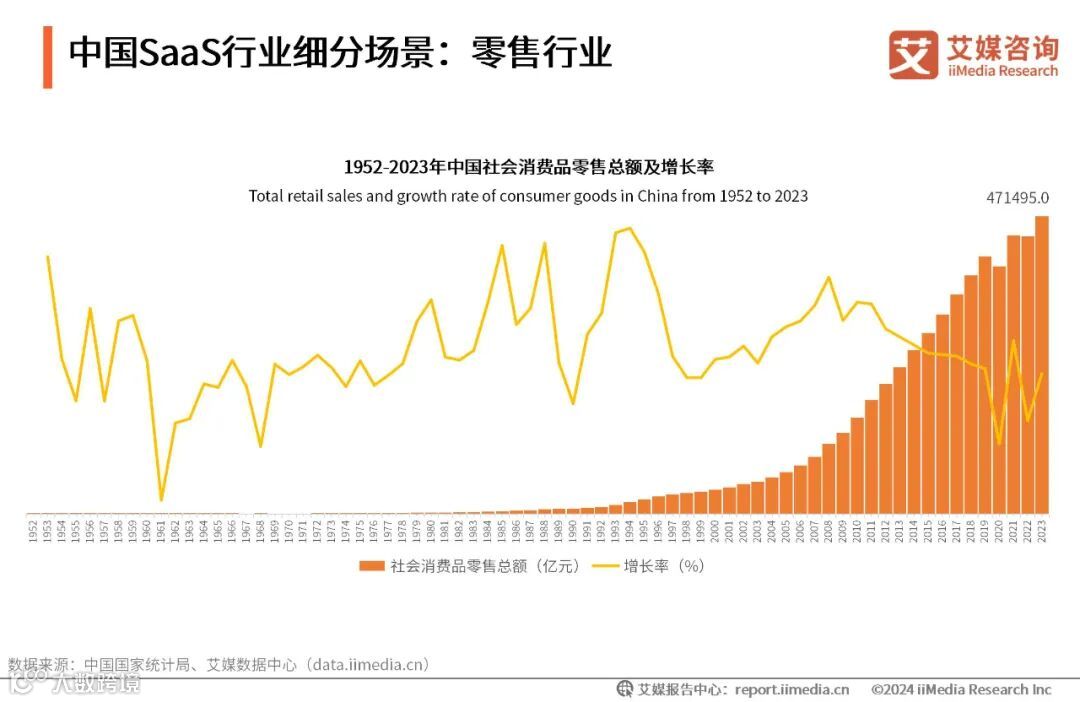 数据显示,1952-2023年间中国社会消费品零售总额整体呈上升趋势,2023年中国社会消费品零售总额为471495亿元,比2022年增长7.2%。艾媒咨询分析师认为,中国零售市场保持稳定增长,随着消费者花销的提升,对零售行业亦提出了新的要求。