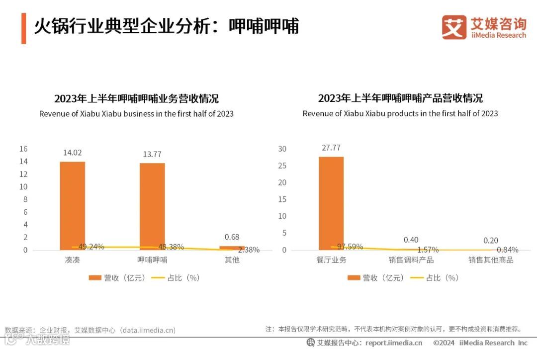 随着2023年扩内需、促消费一系列措施的推进,中国整体市场消费逐步复苏。呷哺呷哺各品牌采取多项积极的营销活动及周年庆储值让利举措,拉动客流到店,使得集团收益初步扭亏为盈。2023年上半年,呷哺呷哺营收为28.5亿元,同比增长32%,凑凑营收14.02亿元,占总营收49.24%;餐厅业务是呷哺呷哺主要营收来源,占比达97.59%。