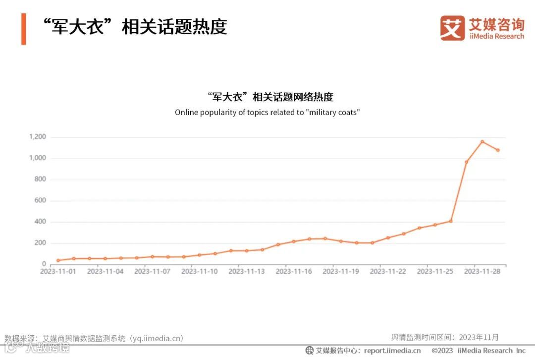 iiMedia Research(艾媒咨询)数据显示,作为抗寒单品的军大衣,在11月期间保有一定的相关话题讨论热度。自11月22日“国产羽绒服涨到7000元”冲上热搜第一,#军大衣#相关话题讨论热度也逐渐增长,于11月28日到达峰值。