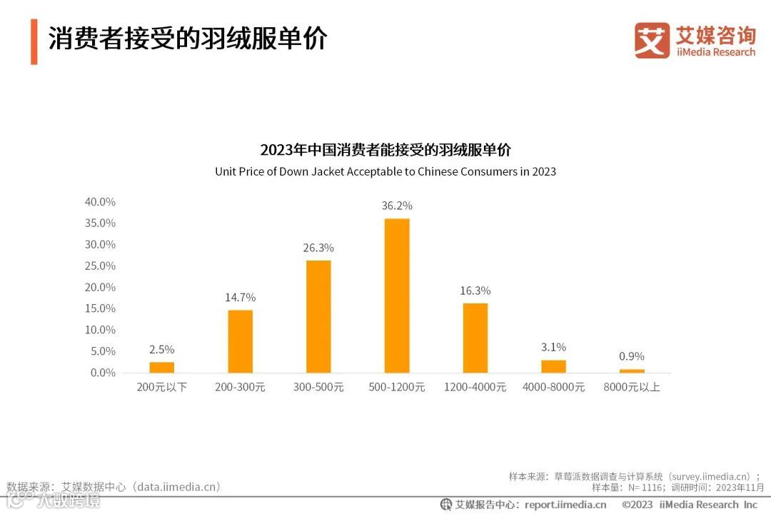 2023年中国消费者能接受的羽绒服单价
