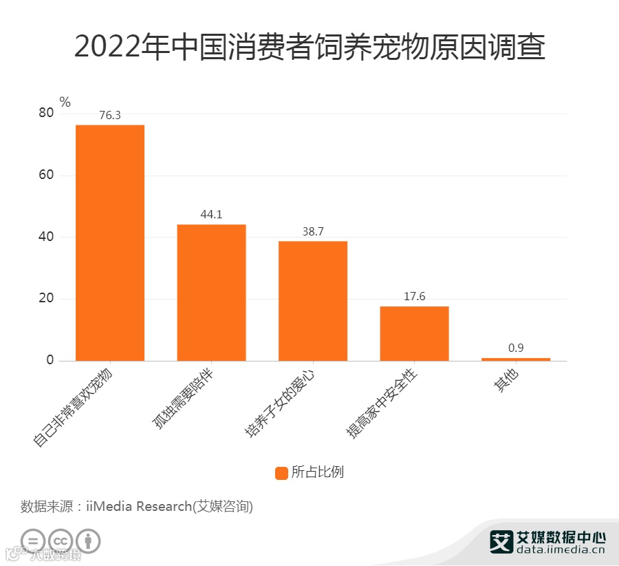 2022年9月18日,“宠物大闸蟹被煮兄弟俩边吃边哭”冲上热搜,宠物与人的关系引起了网友的热议。随着养宠观念的日益深入,人与宠物的情感依赖更加明显,晒宠也成为晒娃、晒美食之后的又一大主题。无论是网络社交还是现实的社交场景中,宠物能使陌生人“破冰”,养宠成为多数人的选择。数据显示,76.3%的消费者是因为自己喜欢而饲养宠物的;其次是需要陪伴和培养爱心,分别占比44.1%和38.7%。