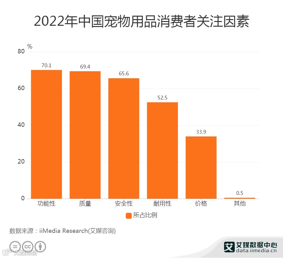 宠物食品、用品、门店服务的低门槛、低技术含量导致大量的无序竞争与同质化问题产生。而中国成熟的供应链代工厂模式,既促进了本土品牌的加速崛起,也导致了产品高度同质化的问题。虽然品牌众多,造型各异,实则功能相差无几,而“易用性”“安全性”两大痛点至今没有完全解决,故障频发、实用性不足也让不少用户给出了“不够智能”“智商税”等负面评价。调研数据显示,70.1%的消费者在购买宠物用品时关注其功能性,其次是质量和安全性,功能、质量、安全才是消费者的核心诉求。