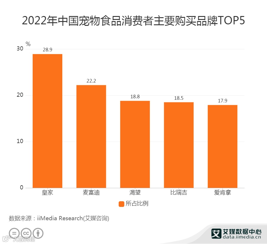 数据显示,消费者购买的宠物食品品牌主要为皇家(28.9%)、麦富迪(22.2%)。目前,在赛道最宽的宠物食品市场,消费者对外资品牌认可度较高,很多“铲屎官”买的都是进口粮。由此可见,国产宠物粮的市场比例仍有很大的提升空间。