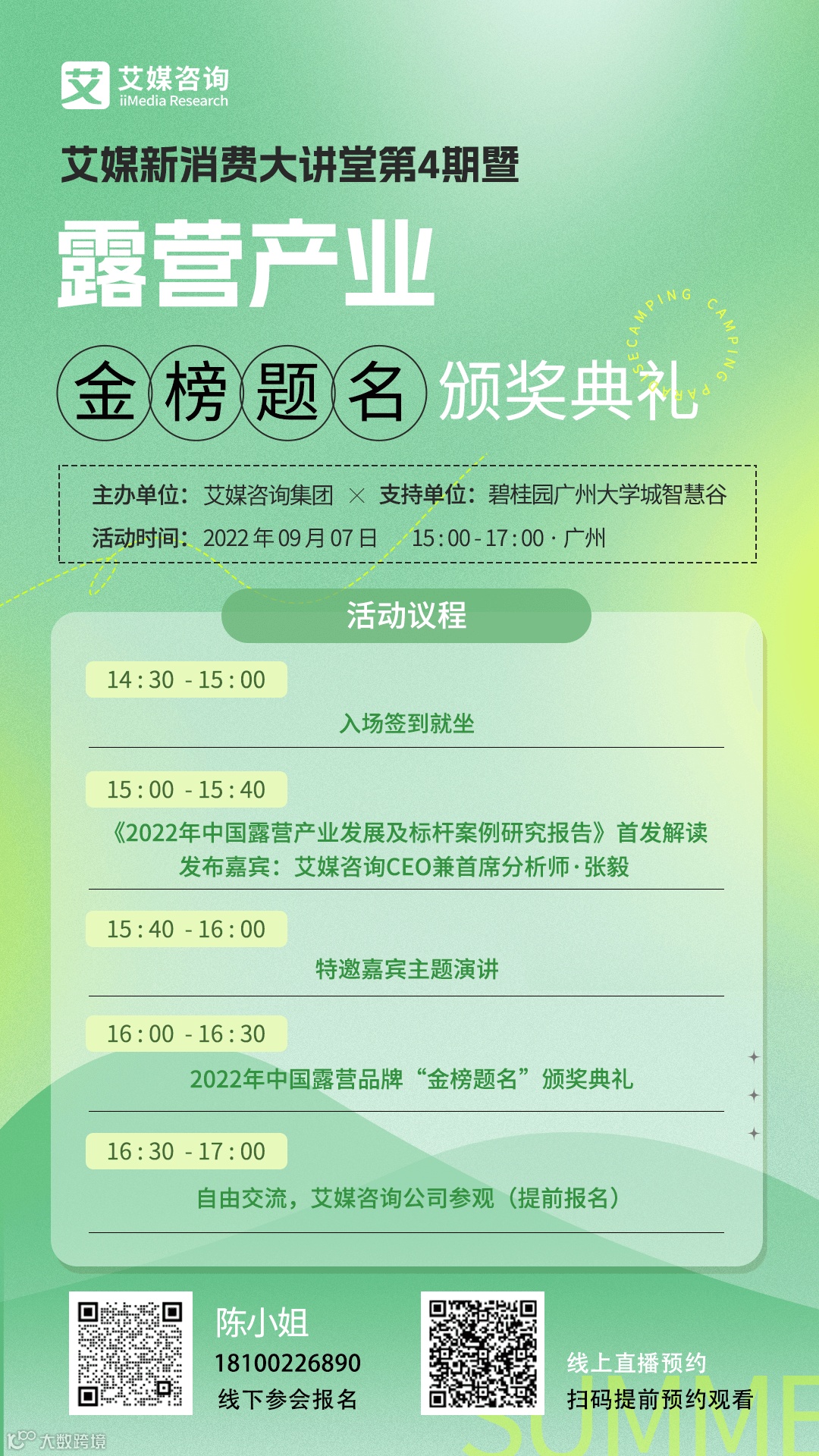 艾媒新消费大讲堂第4期暨露营产业“金榜题名”颁奖典礼参会报名通道已经开启,诚邀更多业内人士报名参会,共议行业话题。