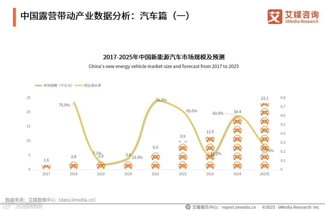 数据显示,2017-2025年中国新能源汽车市场规模呈增长趋势,2024年市场规模为18.4千亿元,预计2025年达23.1千亿元。艾媒咨询分析师认为,露营经济快速发展助推汽车行业向新能源化、功能适配性方向升级,激发车载储能、智能装备及长续航车型需求,加速汽车消费场景与户外生态深度融合。