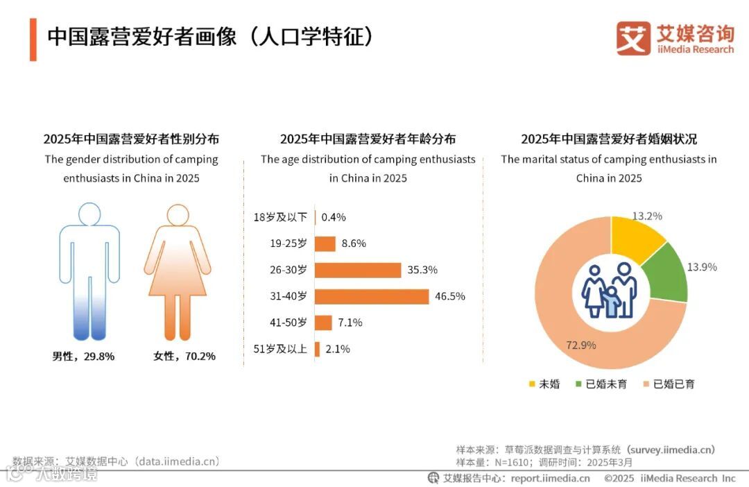 iiMedia Research(艾媒咨询)数据显示,在2025年中国露营爱好者中,女性对露营活动的喜爱程度远高于男性,占比70.2%。从年龄分布来看,青壮年群体意愿高,31-40岁年龄段的人群占比46.5%,而中老年人群体由于身体条件的限制,对户外露营的兴趣相对较低。在婚姻状况方面,已婚已育人群占72.9%,这部分人群通常拥有家庭支持且经济条件相对稳定。