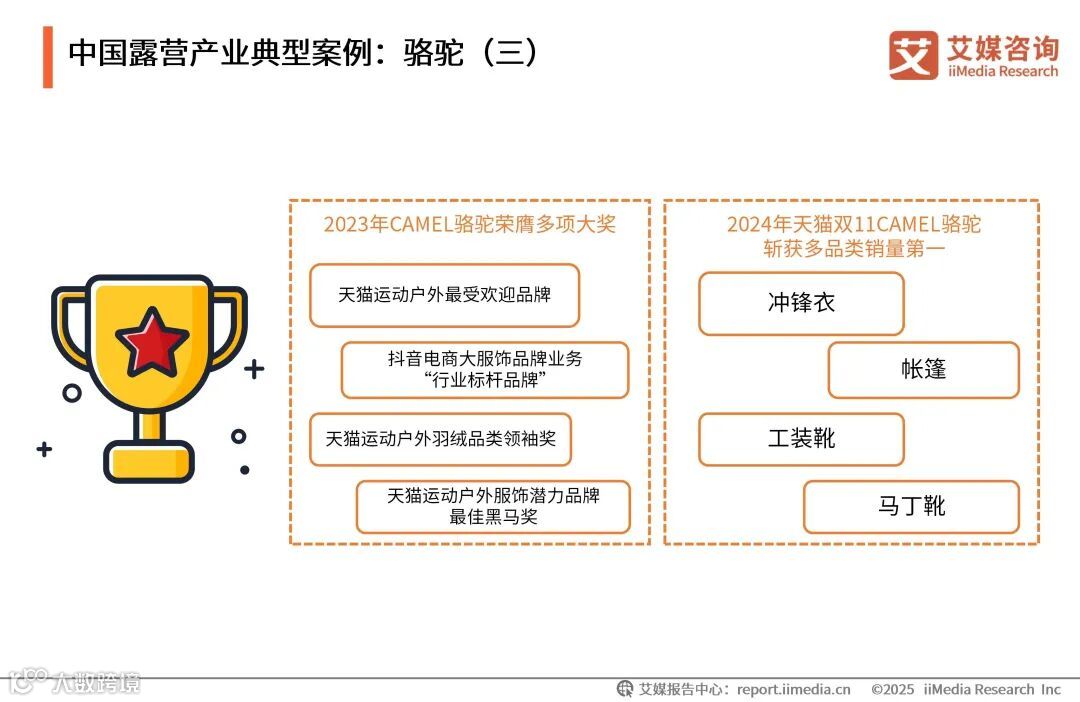 近年来,CAMEL骆驼受到市场及消费者的多方认可。2023年CAMEL骆驼荣膺天猫运动户外峰会“最受欢迎品牌”“羽绒品类领袖奖”“服饰潜力品牌最佳黑马奖”,抖音电商“行业标杆品牌”等多项大奖。2024年天猫双11,CAMEL骆驼斩获冲锋衣、帐篷、工装靴、马丁靴品类销量第一,再次凸显骆驼在行业的领军地位。