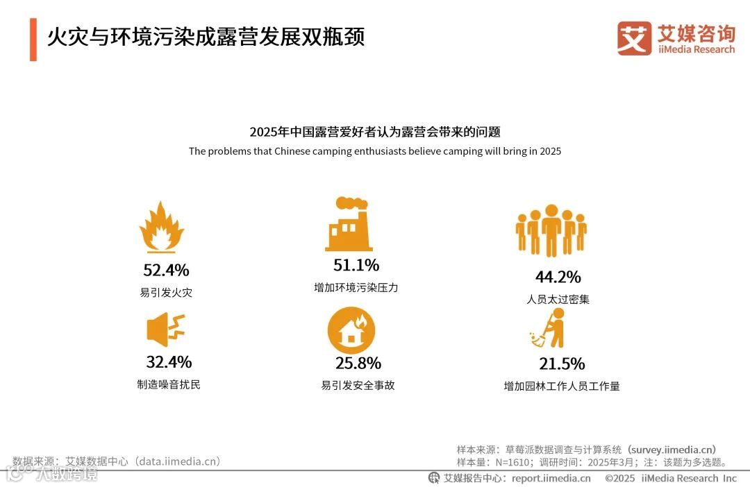 iiMedia Research(艾媒咨询)数据显示,露营爱好者担心露营容易引发火灾,占比52.4%;其次是露营会增加环境污染压力,占比51.1%。艾媒咨询分析师认为,露营经济行业将聚焦火灾防控、环境承载与客流管理等核心痛点。通过强化营地安全标准化建设、推动绿色低碳技术应用及优化生态友好型营地布局,系统性降低环境风险与安全隐患,引导行业向规范集约、可持续的生态化模式转型升级。