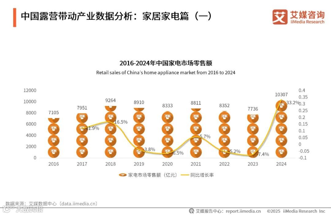 数据显示,2024年中国家电市场零售额10307亿元、同比增长33.2%。艾媒咨询分析师认为,露营经济通过催生户外场景下的新消费需求,推动便携式家电、智能收纳设备及节能取暖等产品创新升级,其“轻量化生活”理念与“场景延伸”特征加速了家电产品功能迭代与市场扩容。