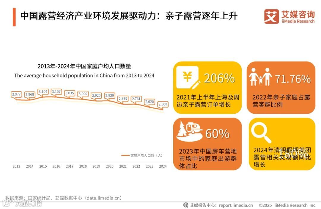 数据显示,2013-2024年中国家庭户均人口持续下降,小型化家庭更追求亲子互动质量,亲子露营成为家庭满足陪伴与教育需求的优选。艾媒咨询分析师认为,家庭规模缩小促使父母聚焦“高质量陪伴”。亲子露营通过“自然+体验”场景,既契合小型家庭灵活出行特点,又满足教育与情感联结需求,由此形成持续火热的发展趋势,成为家庭亲子消费的重要场景延伸。
