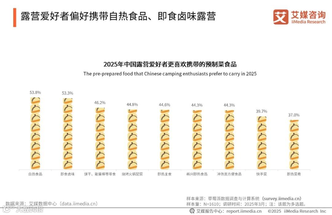 iiMedia Research(艾媒咨询)数据显示,自热食品(53.8%)和即食卤味(53.3%)成为露营爱好者的首选,反映出消费者对轻量化、免烹饪的需求。艾媒咨询分析师认为,露营装备轻量化推动食品消费场景向“即食化”升级,户外餐饮逐渐形成以高热量、易储存为核心的供应链体系。未来,“露营+即食”模式将持续深化,带动食品产业向细分场景渗透。