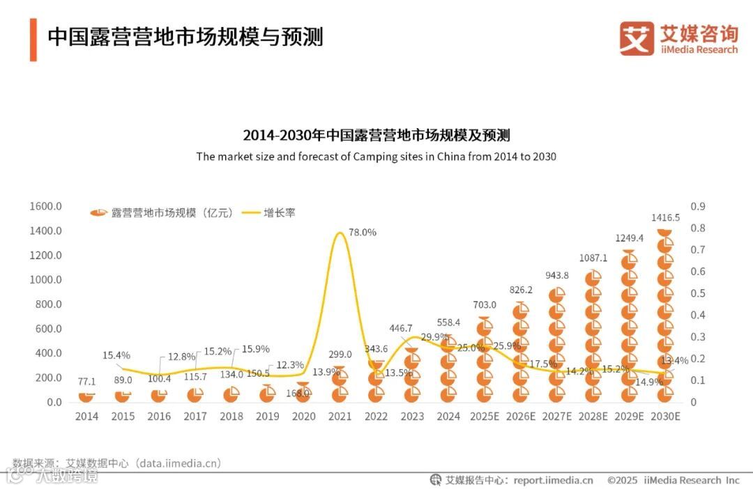 数据显示,2014-2030年中国露营营地市场规模整体呈上扬趋势。2024年露营营地市场规模约558.4亿元,预计2030年将增长至1416.5亿元。艾媒咨询分析师认为,消费升级激发短途自然休闲需求爆发,“露营+亲子/团建”等场景创新拉升消费层级,露营营地产业链协同创新催生“营地+景区/研学”等融合业态,驱动行业向高端化、主题化及生态友好型转变,形成产业链全链条升级,持续释放增长动能。