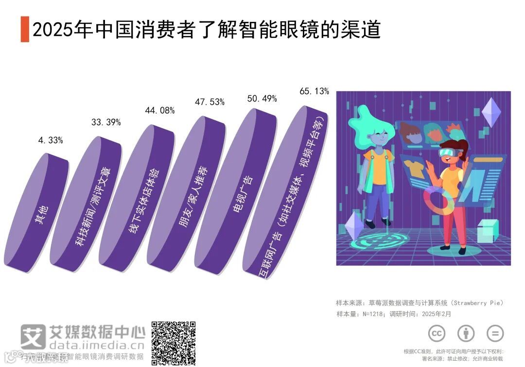 iiMedia Research(艾媒咨询)数据显示,在中国消费者了解智能眼镜的主要渠道调研中,其中65.13%的消费者通过互联网广告(如社交媒体、视频平台等)获取相关信息,50.49%的消费者选择电视广告作为了解途径,47.53%的消费者则通过朋友或家人的推荐来了解智能眼镜,44.08%的消费者会选择在线下实体店进行体验,而33.39%的消费者则通过科技新闻或评测文章来获取相关资讯。