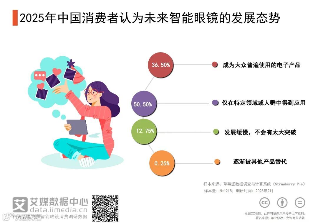 iiMedia Research(艾媒咨询)数据显示,中国消费者对未来智能眼镜发展态势看法如下,36.50%的消费者认为它将成为大众普遍使用的电子产品,50.50%的消费者认为它仅在特定领域或人群中得到应用,12.75%的消费者认为其发展将缓慢且不会有太大突破,而0.25%的消费者则认为它将逐渐被其他产品替代。