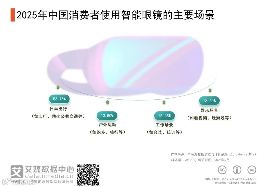 在中国消费者在使用智能眼镜主要场景调研中,数据显示,53.75%的消费者会选择日常出行(如步行、乘坐公共交通等),12.50%的消费者会选择户外运动(如跑步、骑行等),15.25%的消费者会在工作场景中使用(如会议、培训等),而18.50%的消费者则会在娱乐场景中使用(如看视频、玩游戏等)。