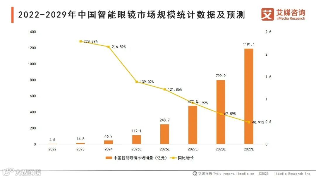 2025年,中国智能眼镜迎来高光时刻。在B端层面,无论是科技大厂,还是创业企业等诸多企业均在跑步入场智能眼镜领域,整个行业似乎在“狂欢”。这种现象的出现,一方面与AI的快速发展、风口息息相关;另一方面,眼镜形态产品被普遍认为是AI的最佳载体之一;再者,国外已出现了爆款单品,极大地起到了推动作用;此外,资本也在流向该领域。多重因素综合影响之下,造就了当下智能眼镜赛道的如火如荼。iiMedia Research(艾媒咨询)监测研究数据显示,2024年中国智能眼镜市场规模为46.9亿元,较2023年增长216.89%。预计2029年全国智能眼镜市场规模有望达1191.1亿元。