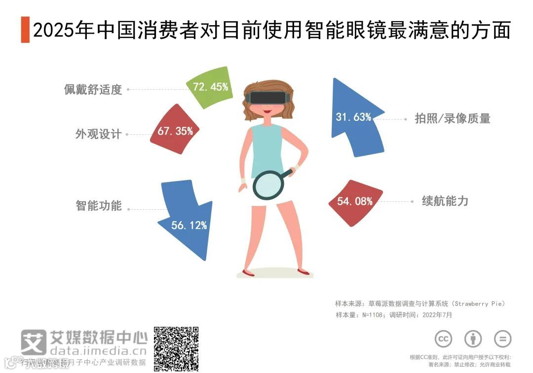 iiMedia Research(艾媒咨询)数据显示,在整体满意度方面,超过八成的中国消费者对智能眼镜表示满意。具体而言,消费者最满意的方面依次为:佩戴舒适度(72.45%)、外观设计(67.35%)、智能功能(56.12%)、续航能力(54.08%),以及拍照/录像质量(31.63%)。