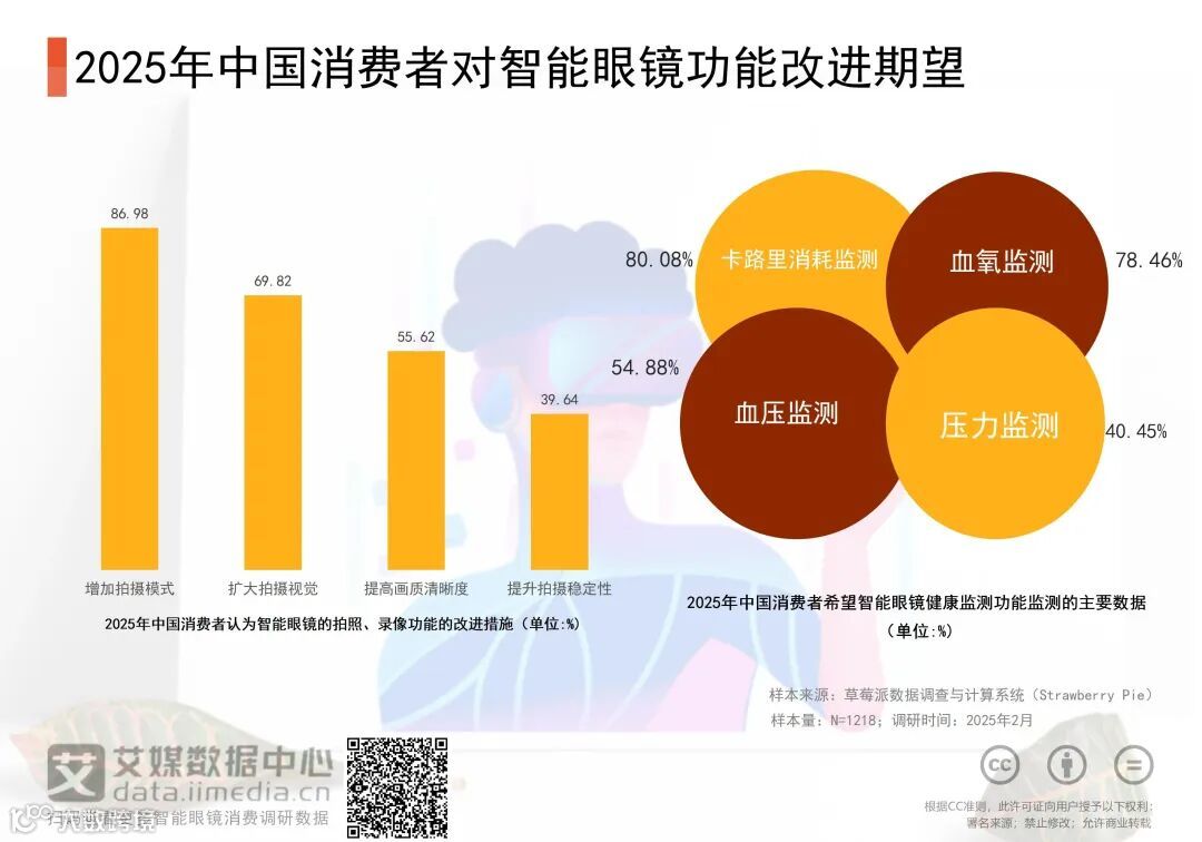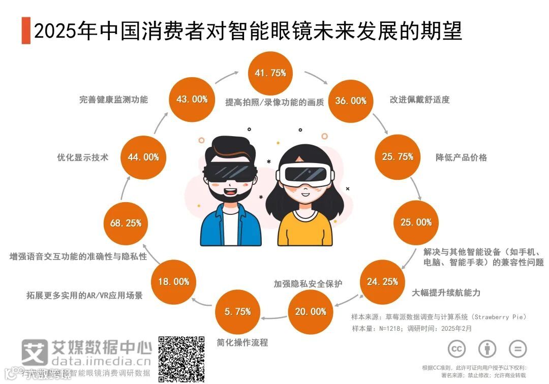 iiMedia Research(艾媒咨询)数据显示,中国消费者对智能眼镜未来发展的期望调研显示,68.25%的消费者希望增强语音交互功能的准确性与稳定性;44.00%的消费者期望优化显示技术;43.00%的消费者希望完善健康监测功能;41.75%的消费者期待提高拍照/录像功能的画质;36.00%的消费者则希望改进佩戴舒适度。