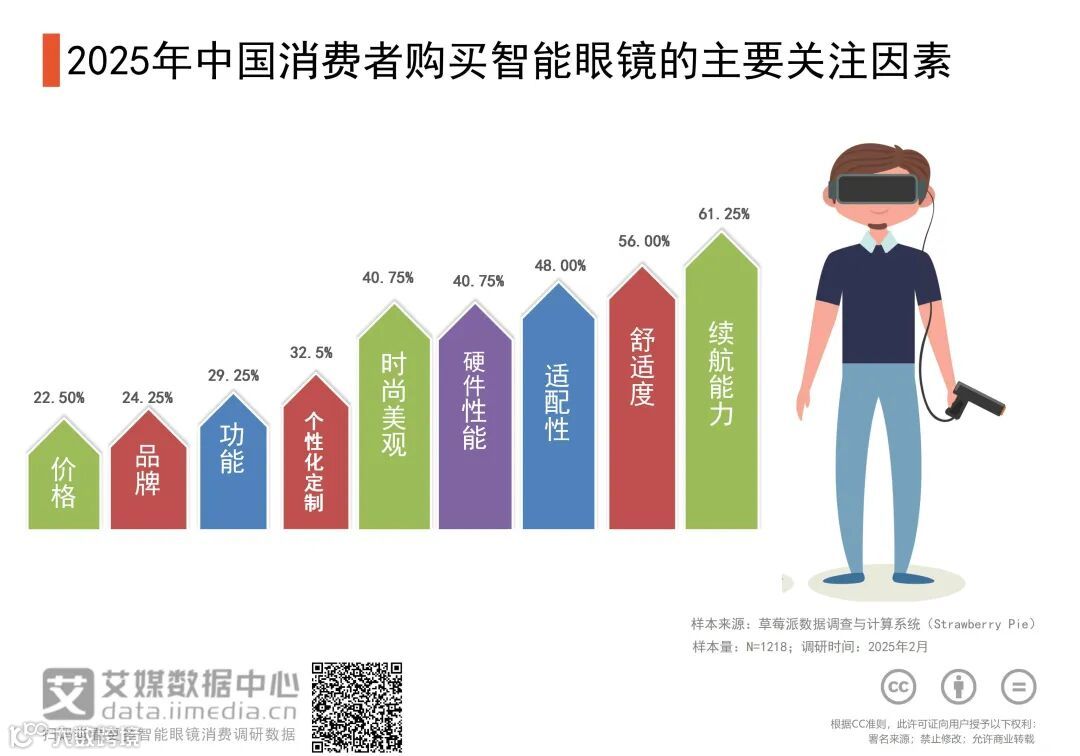 iiMedia Research(艾媒咨询)数据显示,中国消费者在购买智能眼镜时主要关注以下几个因素:续航能力(61.25%)、舒适度(56.00%)、适配性(48.00%)、硬件性能(40.75%),以及时尚美观(40.75%)。