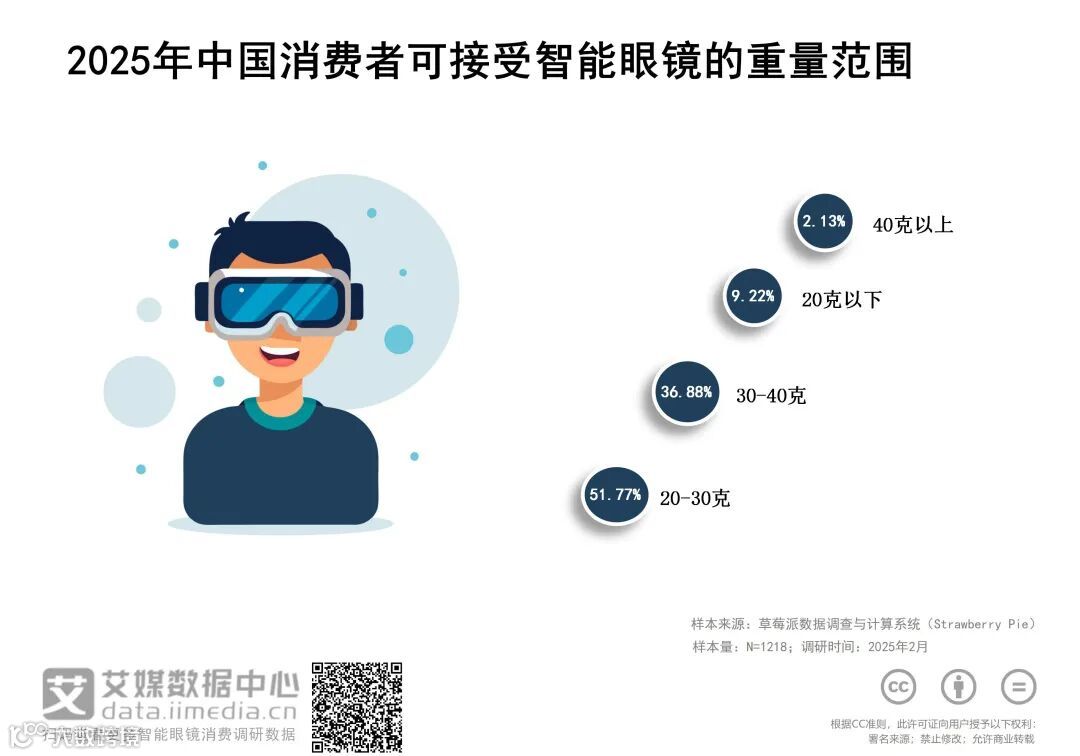 iiMedia Research(艾媒咨询)数据显示,在中国消费者对智能眼镜可接受的重量范围调研中,9.22%的消费者希望重量在20克以下,51.77%的消费者选择20-30克,36.88%的消费者接受30-40克,仅有2.13%的消费者能够接受40克以上的重量。