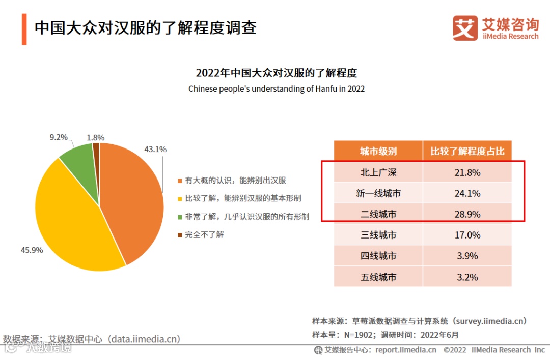 调研数据显示,2022年中国有45.9%的受访者表示比较了解汉服,能辨别出汉服的基本形制,此外有43.1%表示对汉服有大概的认识。从城市级别来看,主要为北上广深、新一线和二线城市居民对汉服了解较多。艾媒咨询分析师认为,越来越多中国民众对汉服有一定的了解,经济相对发达地区民众对汉服的了解更加深入。