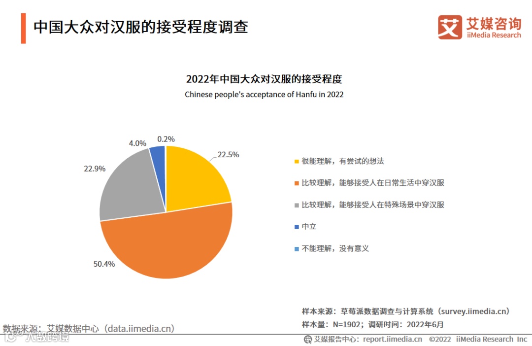 调研数据显示,2022年,50.4%的受访者表示比较理解并能接受人在日常生活中穿汉服。22.5%的受访者表示很能理解,有尝试穿汉服的想法。22.9%的受访者表示能够接受人在特殊场景中穿汉服,4.0%的受访者表示中立。仅有0.2%的受访者表示不能理解汉服,认为没有意义。艾媒咨询分析师认为,相比2021年,大众对汉服的接受度不断提高,汉服越来越日常化、大众化。