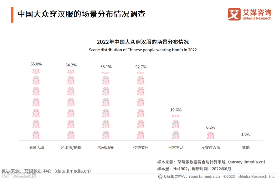 调研数据显示,2022年,超过五成的受访者会在汉服活动、艺术照拍摄、特殊场景和传统节日等场景穿汉服,19.6%的受访者会在日常生活中穿汉服,而6.2%的受访者没穿过汉服。艾媒咨询分析师认为,可推动汉服进行日常化改进,让汉服成为日常衣物的一部分,促进汉服和传统文化的发展。
