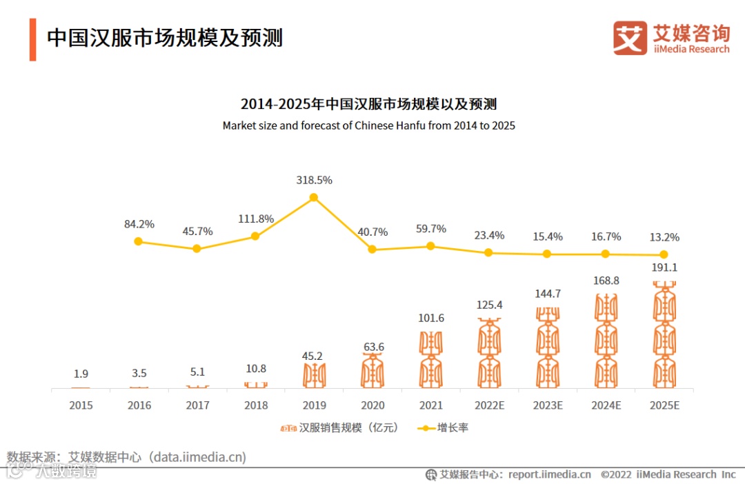 iiMedia Research(艾媒咨询)数据显示,2015年-2021年中国汉服市场快速发展,2022年市场规模预计达125.4亿元,同比增长23.4%,2025年有望达到191.1亿元。未来汉服市场仍有较大的上行空间。